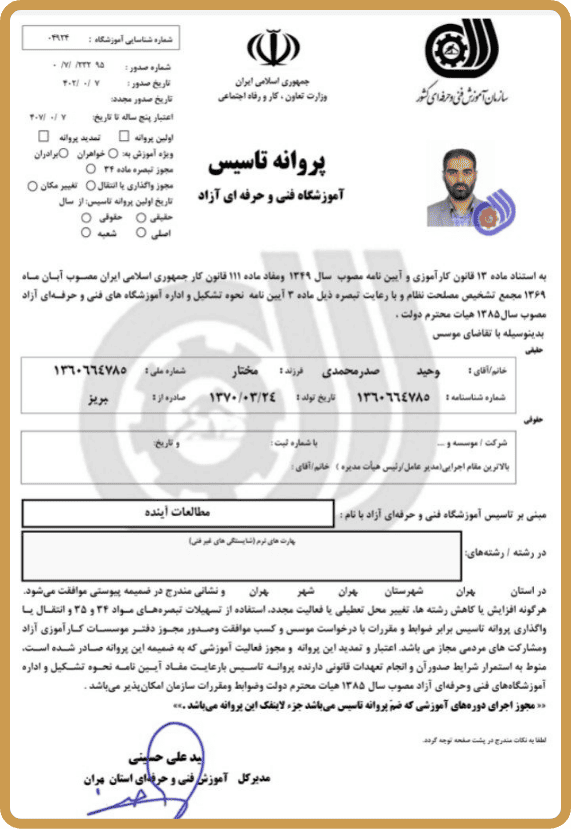با افتخار باید اعلام کنم که ما، به عنوان تنها اکادمی آموزشی ایندهپژوهی، مفتخر به دریافت مدرک رسمی از سازمان فنی و حرفهای ایران هستیم. این مدرک، تأییدی از استانداردهای بینالمللی و تاثیرگذاری ما در زمینهی ارائهی آموزشهای پیشرو و نوآورانه را نشان میدهد. از تکنولوژیهای پیشرفته تا مباحث مرتبط با علوم انسانی و اجتماعی، ما تمام تلاش خود را برای ارتقاء دانش و مهارتهای شاگردانمان به کار میگیریم. این مدرک، نشان از تعهد ما به کیفیت و بهروز بودن آموزشهایمان است و زمینهای را برای رشد و شکوفایی شاگردان در مسیر حرفهایشان فراهم میکند.